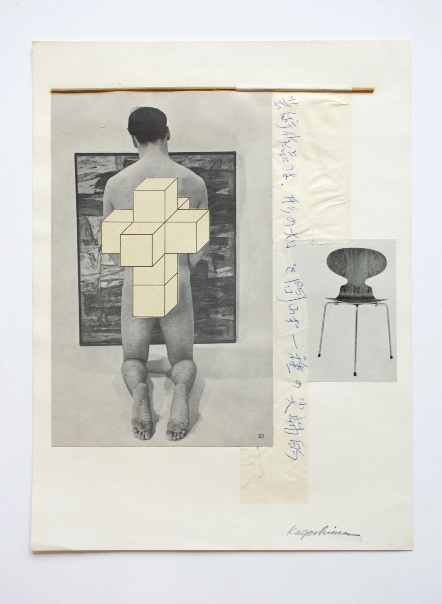 The collage works highlight Kagoshima’s ingenuity in handling diverse materials, vivid graphic sensibility, and a sharp sensitivity to imagery. Some incorporate images of male bodies sourced from vintage gay erotica magazines, a reflection of Kagoshima’s time living in the West Village in NYC, while others reduce the figure to drawn or painted fragments that interact with cut paper forms. In one example, he includes a fragment of Japanese: “A work of art is a form of cutting-edge, whether large or small …” (芸術作品は、形の大小を問わず一種の先端的…). Indeed, this work in a modest size demonstrates his morphological ambition that characterizes his oeuvre from this period.