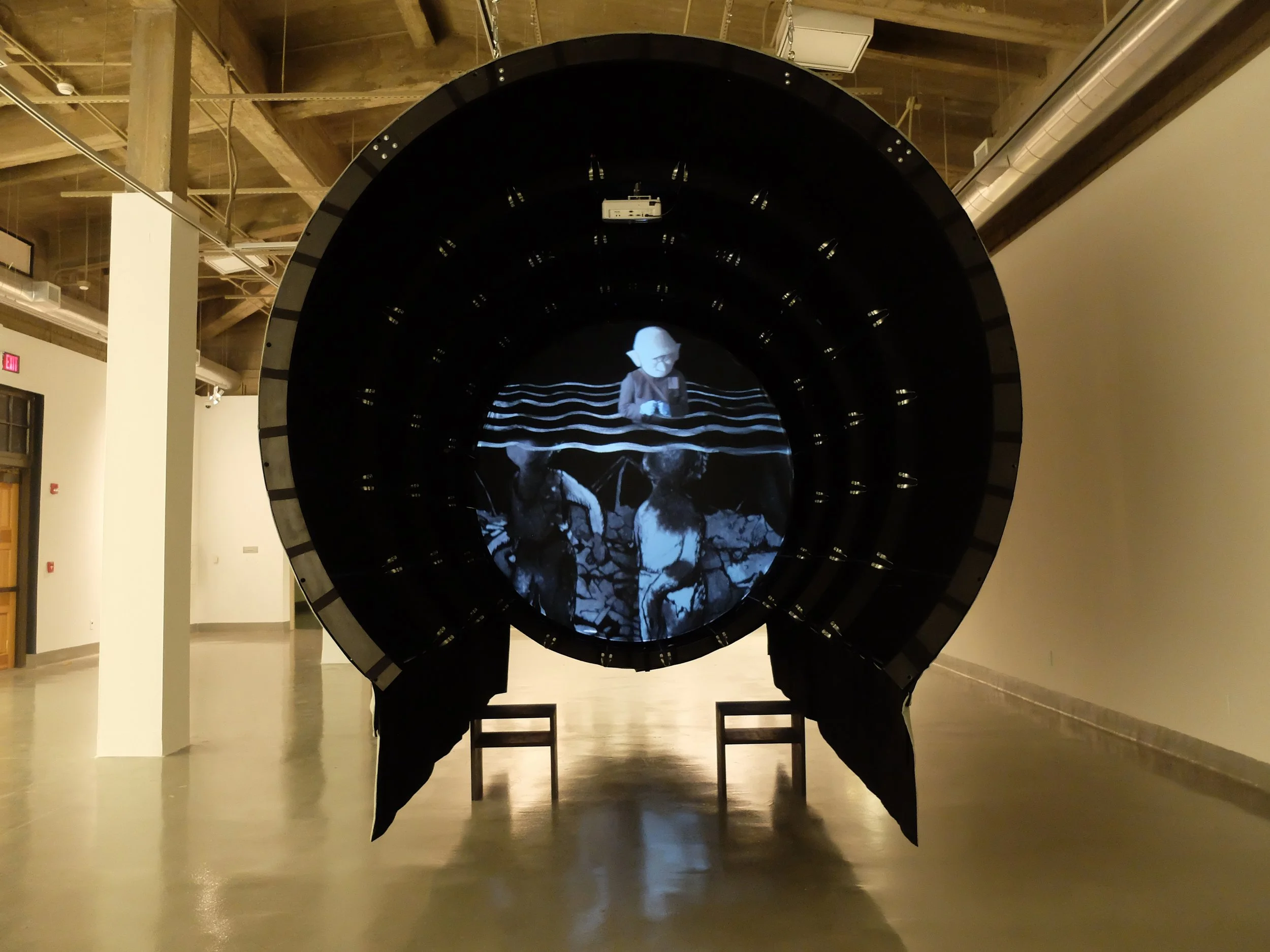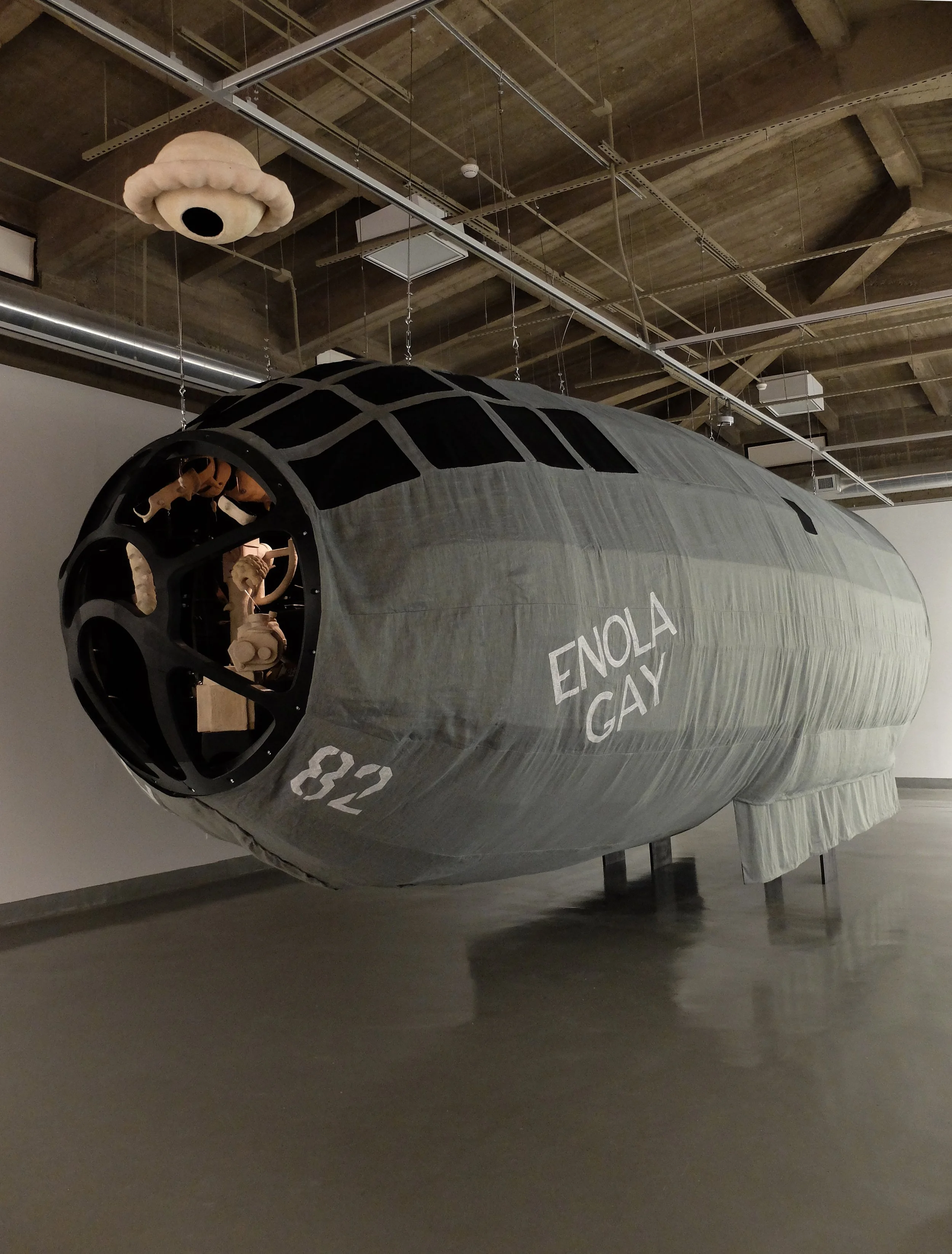 Linen fabric, blackout fabric, paint, wood, electric metallic tubing, plastic, vintage lampshade, vintage bomber seat belts, vintage protective hood, vintage backpack, vintage canteen, glass bottles, bamboo, legless seatbacks, turtle shell, elk horns, wood powder, wheat flour, wood glue, hemp cloth, sumi ink, paper clay, projector, amplifier, speakers, and video