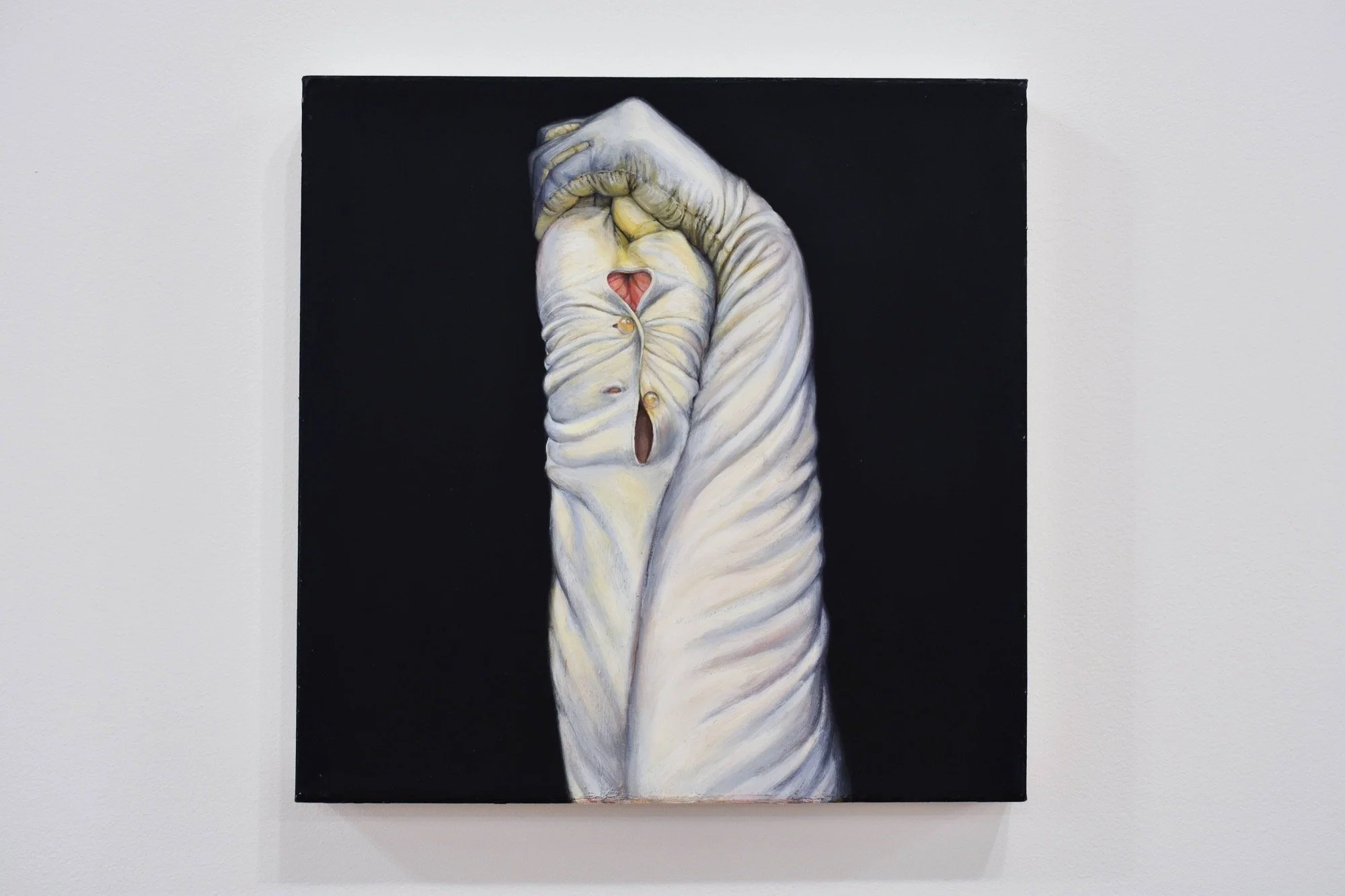 Jen Mazza will showcase a selection of figurative paintings including her 2004 series, Nuit Blanche, which represent an incredibly significant moment in her life and work. This series marks the transitional moment when she is shifting away from depictions of the landscape that had been her prior focus. Mazza instead began painting and drawing women's bodies, often using her own body as model. “The Nuit Blanche series was deeply important in the development of my work. The materiality of the figurative painting crosses over directly into my current practice, as does a subtle sense of disruption—queering—as both noun and verb, I am always trying to embody something in terms of this otherness.” In these paintings, Mazza, who came out as queer in 2000, embodies a subtle dissociation by using her left hand and its mirror image to reenact what at first seems to be a first-person perspective in which two hands and arms adorned in kid gloves* engage in performative acts.