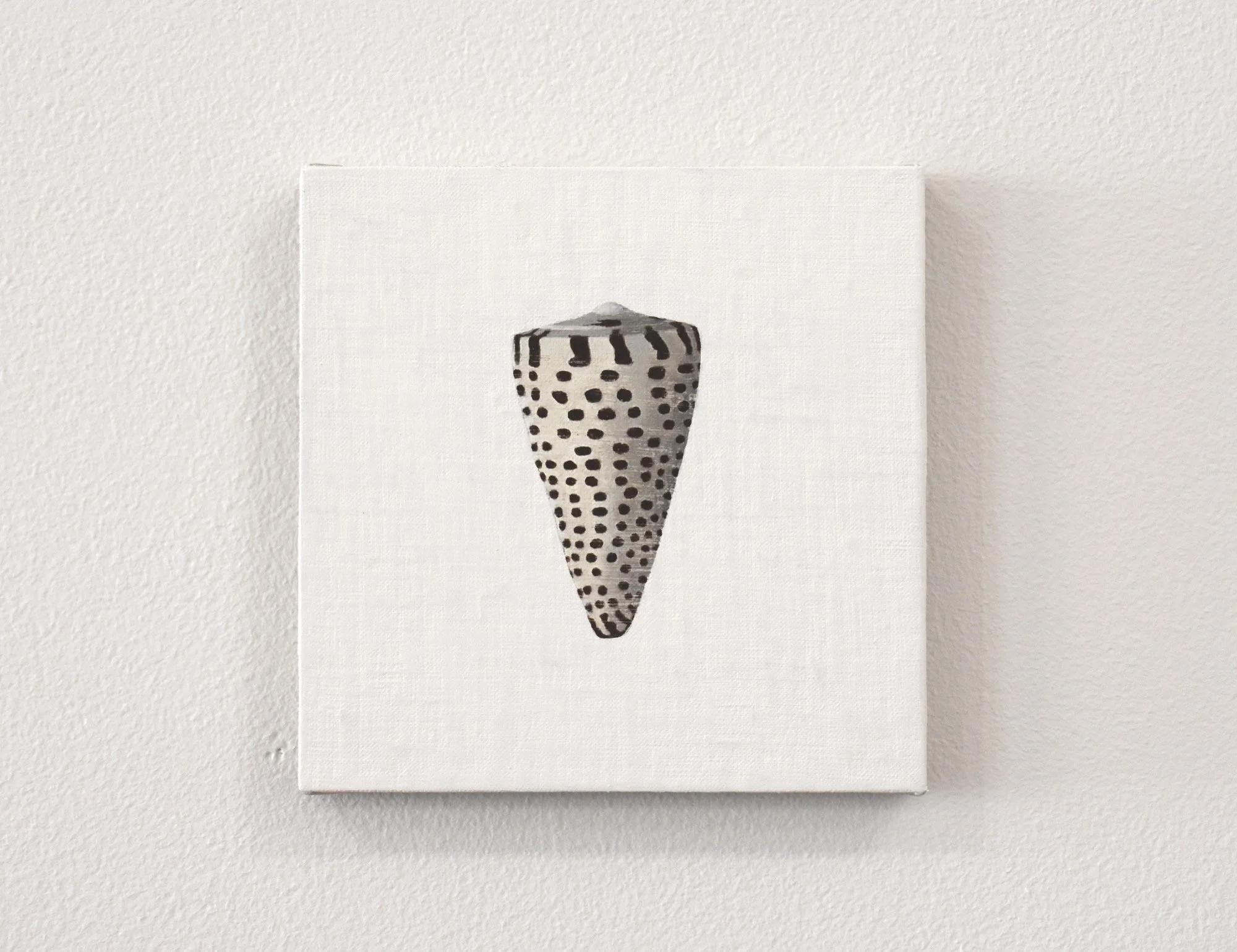 Maryam Amiryani, Shelter: Conus Leopardus, 2024. Oil on linen over wood, 5 x 5 x 1/2 inches / 12.7 x 12.7 x 1.3 cm