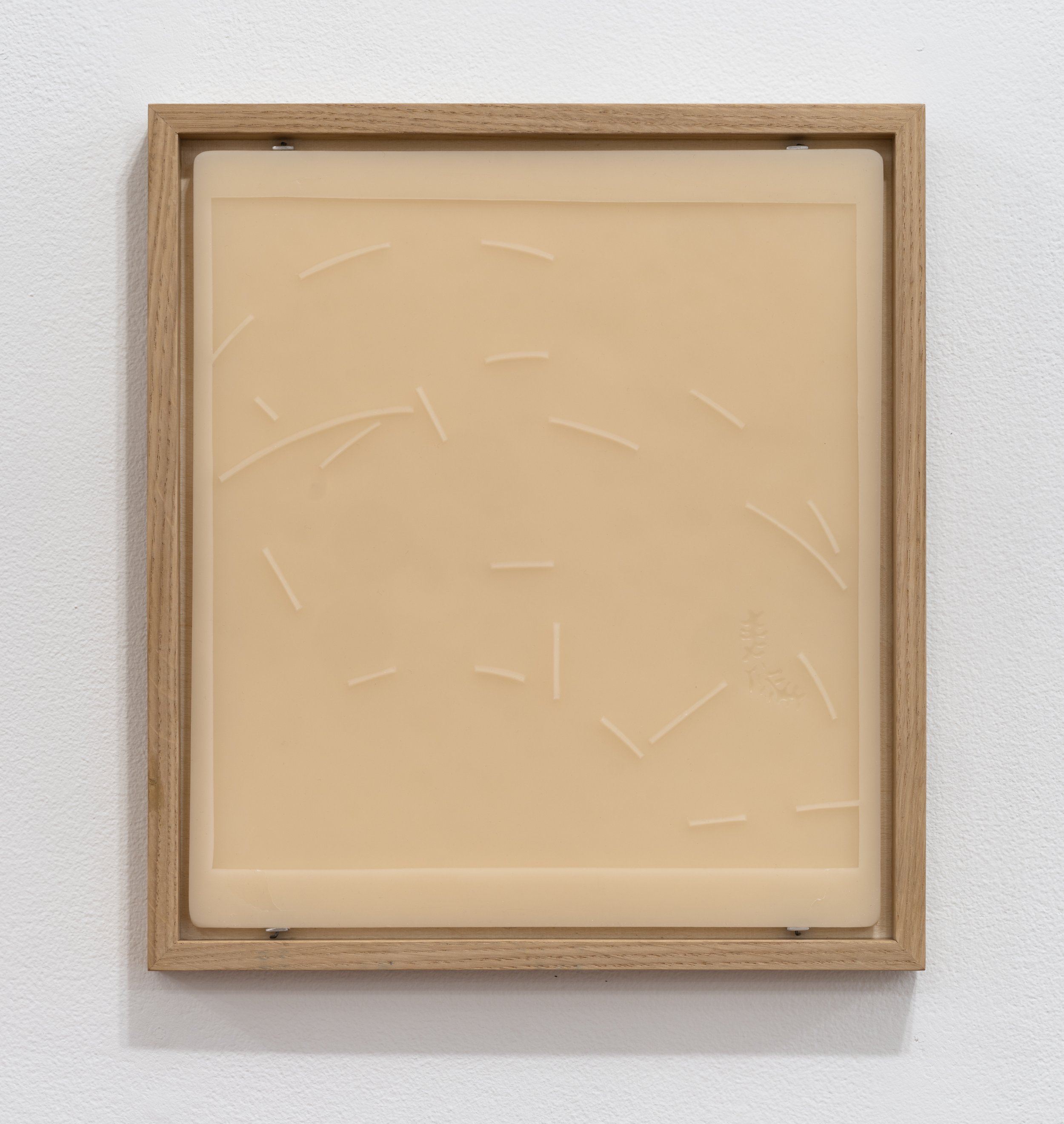 Elina Vainio’s delicate beeswax reliefs bring forward the tension and fragility inherent in these connections. Using beeswax—a material produced through the collective labor of honeybees—Vainio embeds artificial and handmade objects within its surface, creating tenuous visual and material relationships. In Earthquake (Yamamura Koka), the inlaid black-and-white image is a reproduction of Yamamura Koka’s sketch of the destruction caused by the 1923 Great Kanto Earthquake. While beeswax appears visually frail, it is materially resilient, prompting viewers to reconsider what they know about the space nature occupies around and within us. The boundaries between culture and nature, as well as humanity’s assumptions about permanence, are quietly questioned.