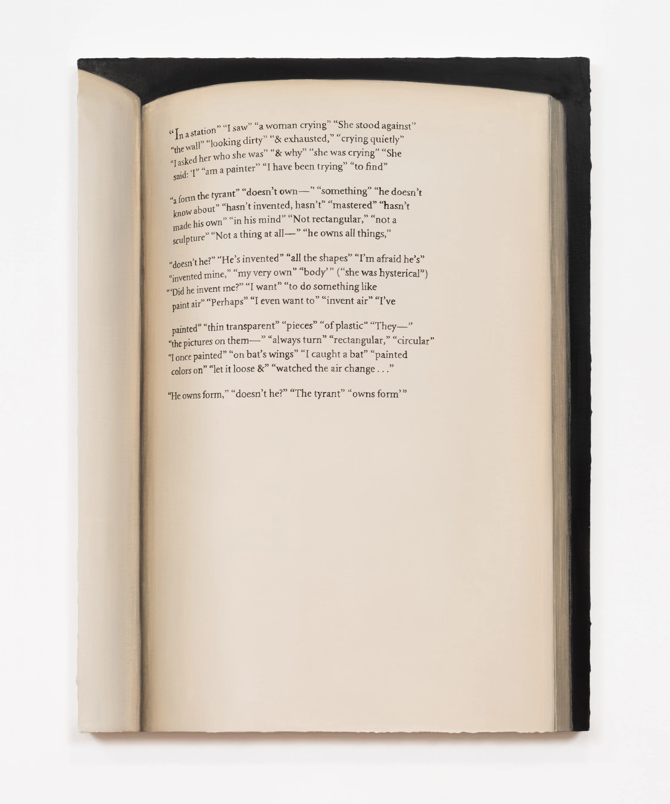 Mazza’s most recent work, “In a Station,” illusionistically depicts a page of text from Alice Notley’s book The Descent of Alette. In Notley’s celebrated feminist narrative poem, a narrator named Alette descends underground, not to hell, but into a network of scenes that resemble NYC in the late 80’s. The rhythm and tension of Notley’s words and pauses draw in the viewer in much the same way as Mazza’s images create an atmosphere that feels urgent and unsettling. The linear hanging of this show emphasizes a kind of confounding repetition that obscures more than it reveals.
