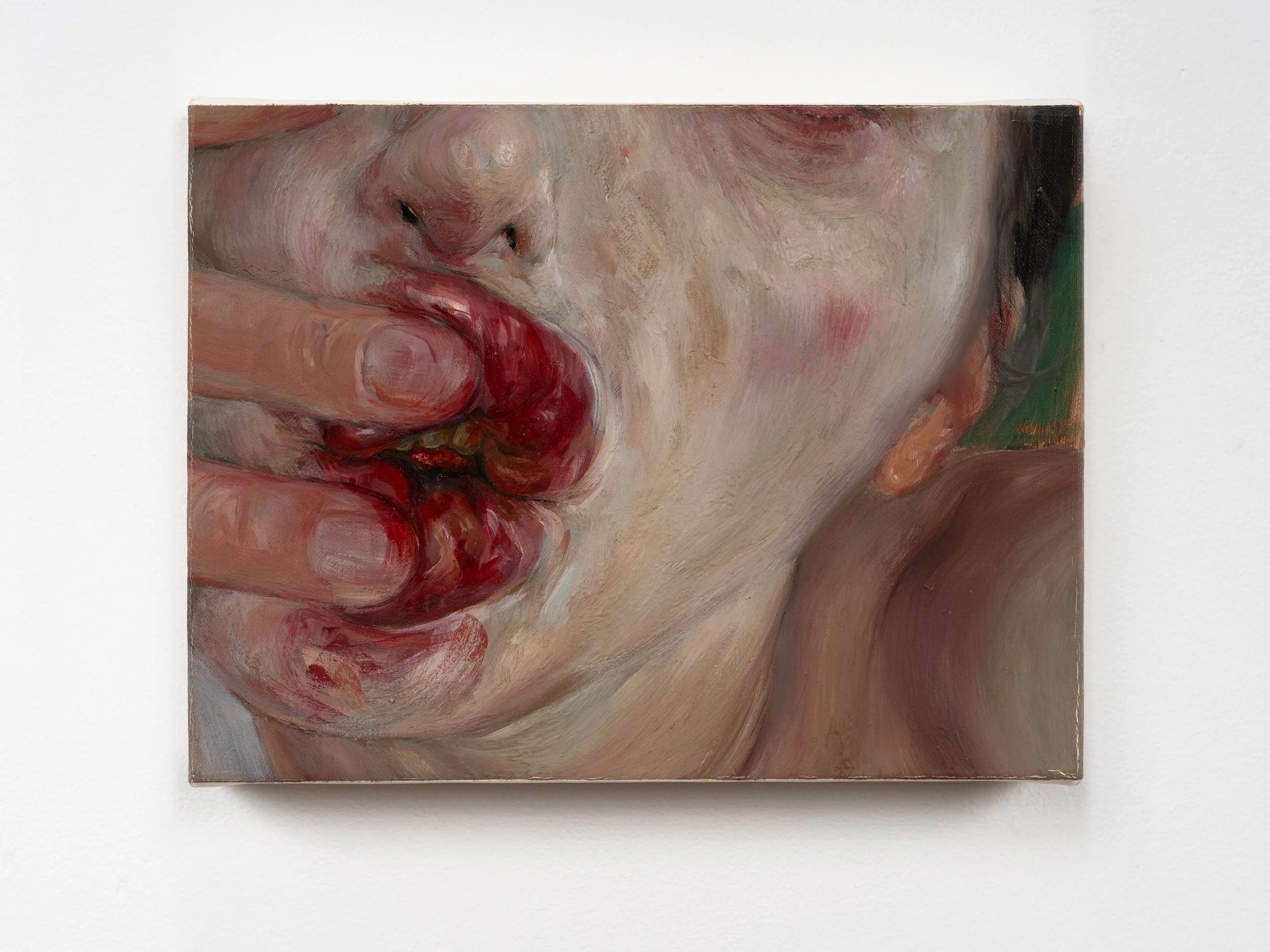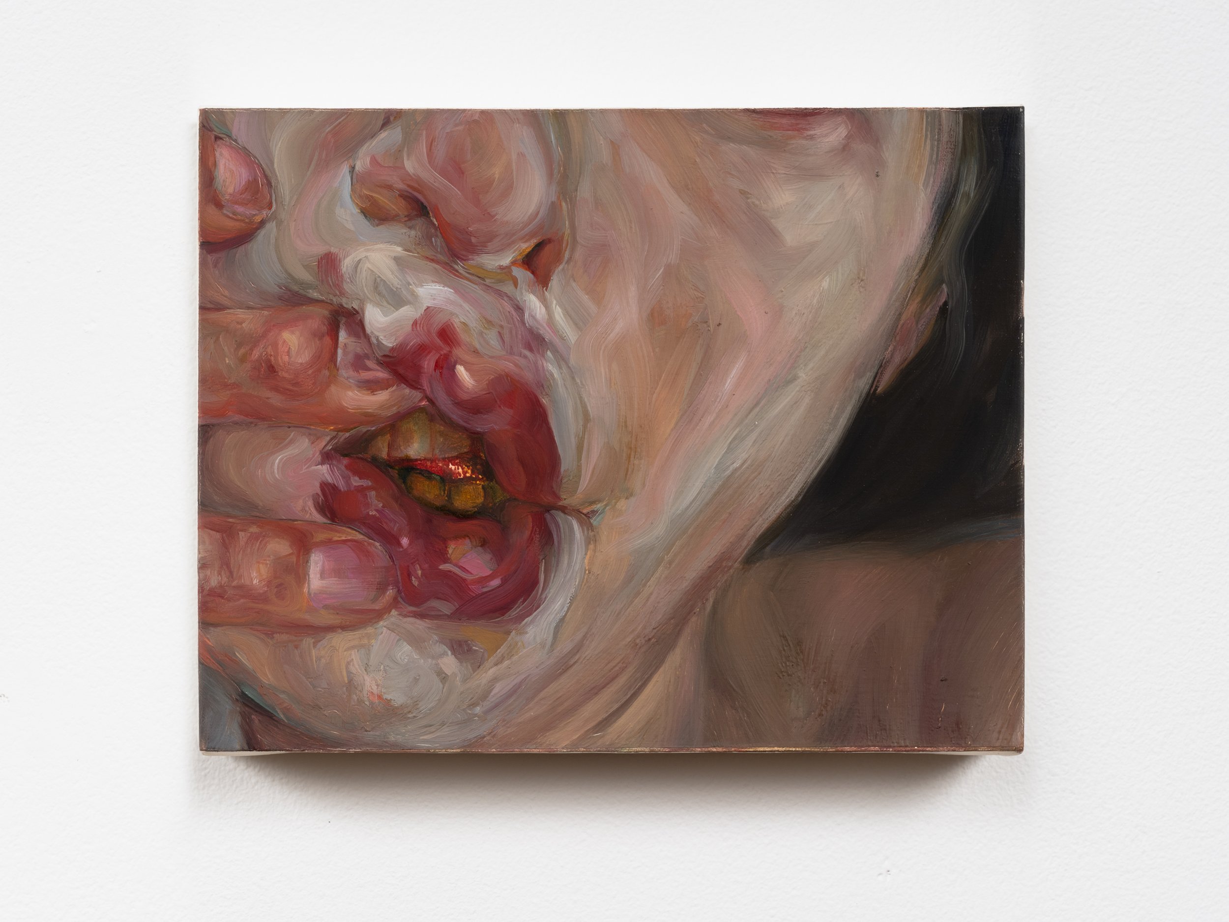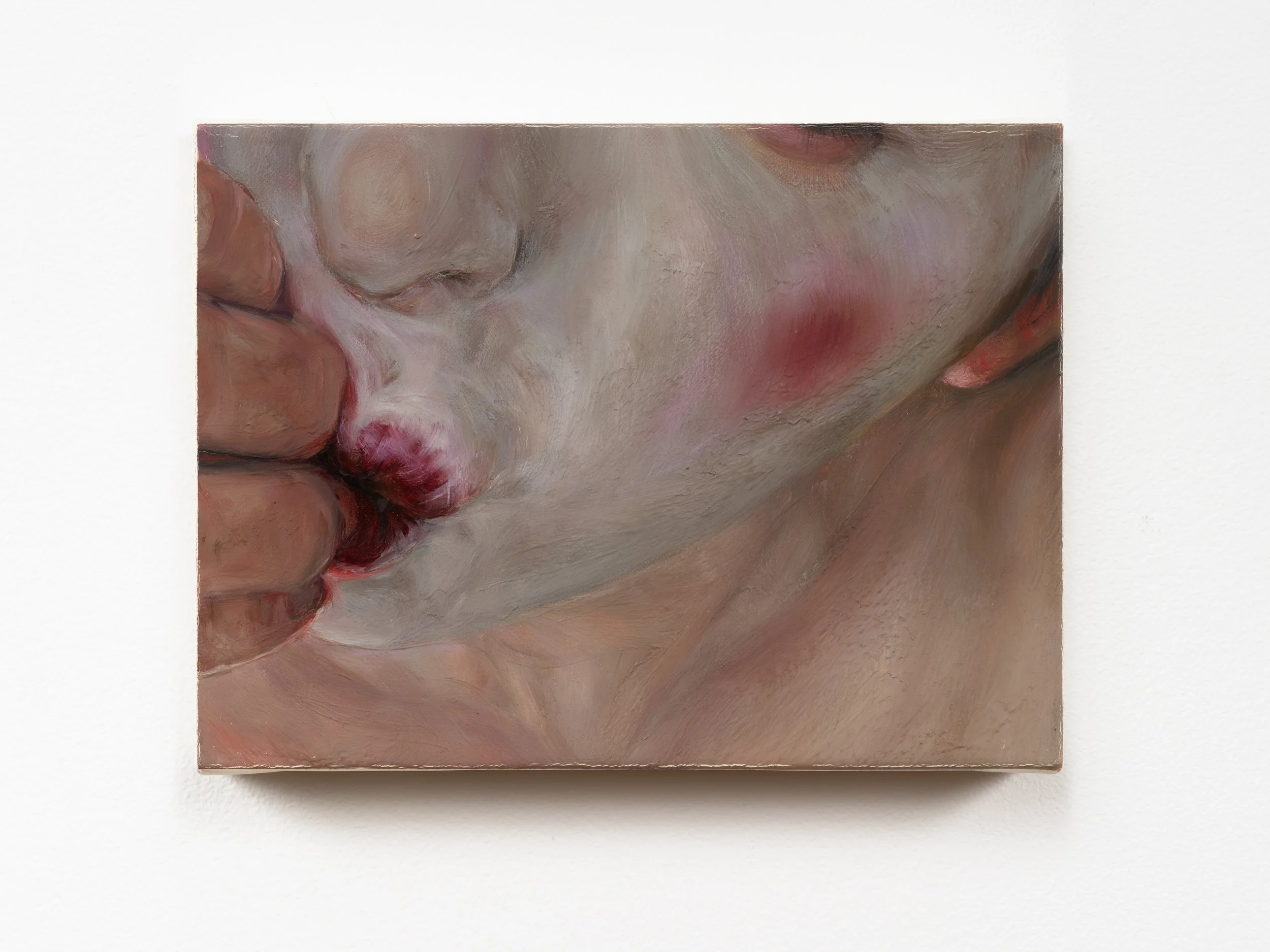 Mazza’s Ceruse paintings are a series of works similar in size and imagery that show fragments of a face in extreme close-up views. Seen together, these works form a connected sequence which is highly performative. Seemingly unwelcome gestures compress and twist her flesh in closely cropped and pantomimed images of emotional theater that are intimate, yet slightly unnerving. Fingers mold and manipulate the flesh of cheeks and lips, as in Equivalence (2008), where a hand forcefully presses red berries to distort the plump, exaggerated, rouged lips. Not intended as self-portraits, these images defamiliarize the facial features, rather than prompt recognition.