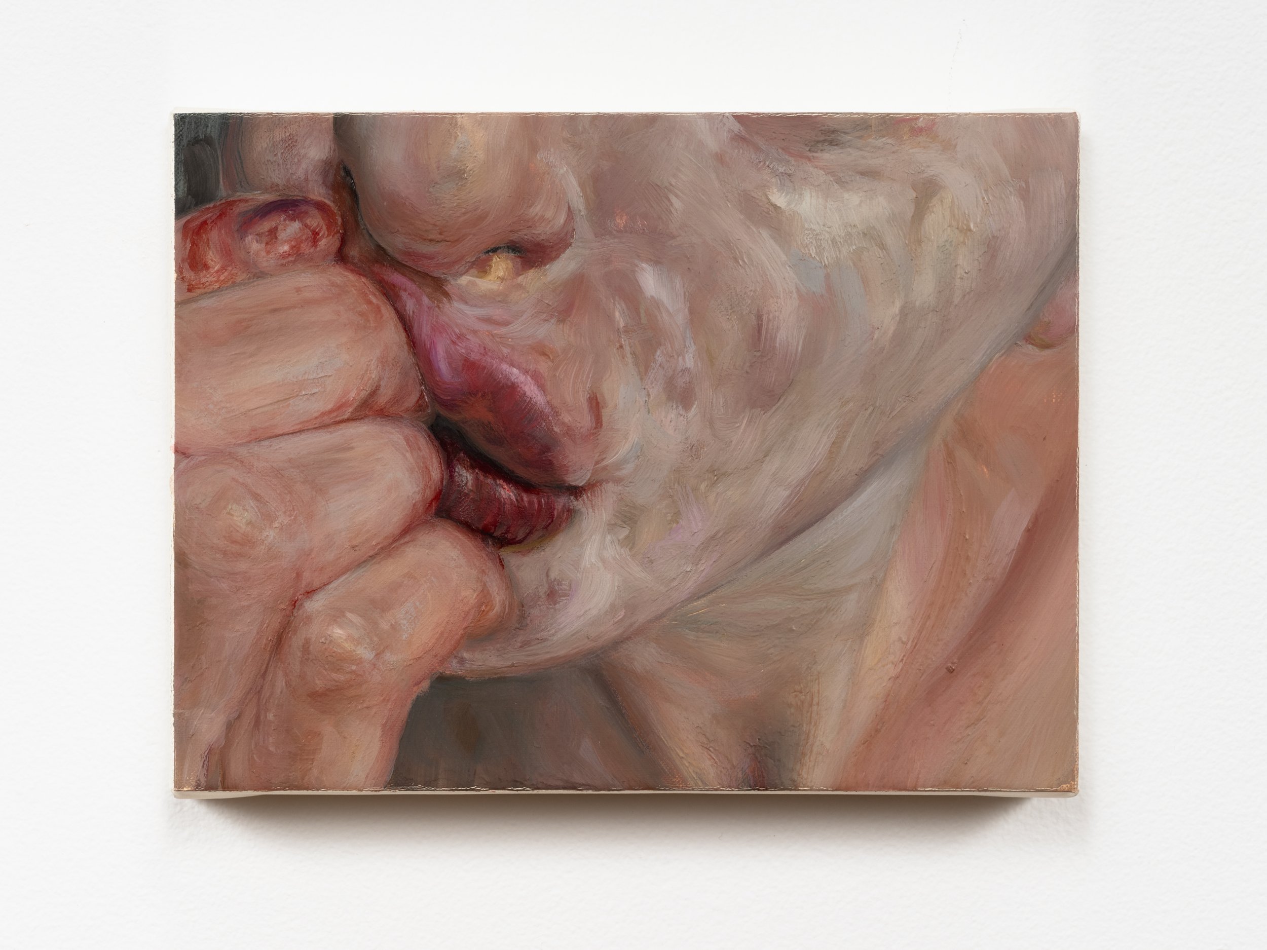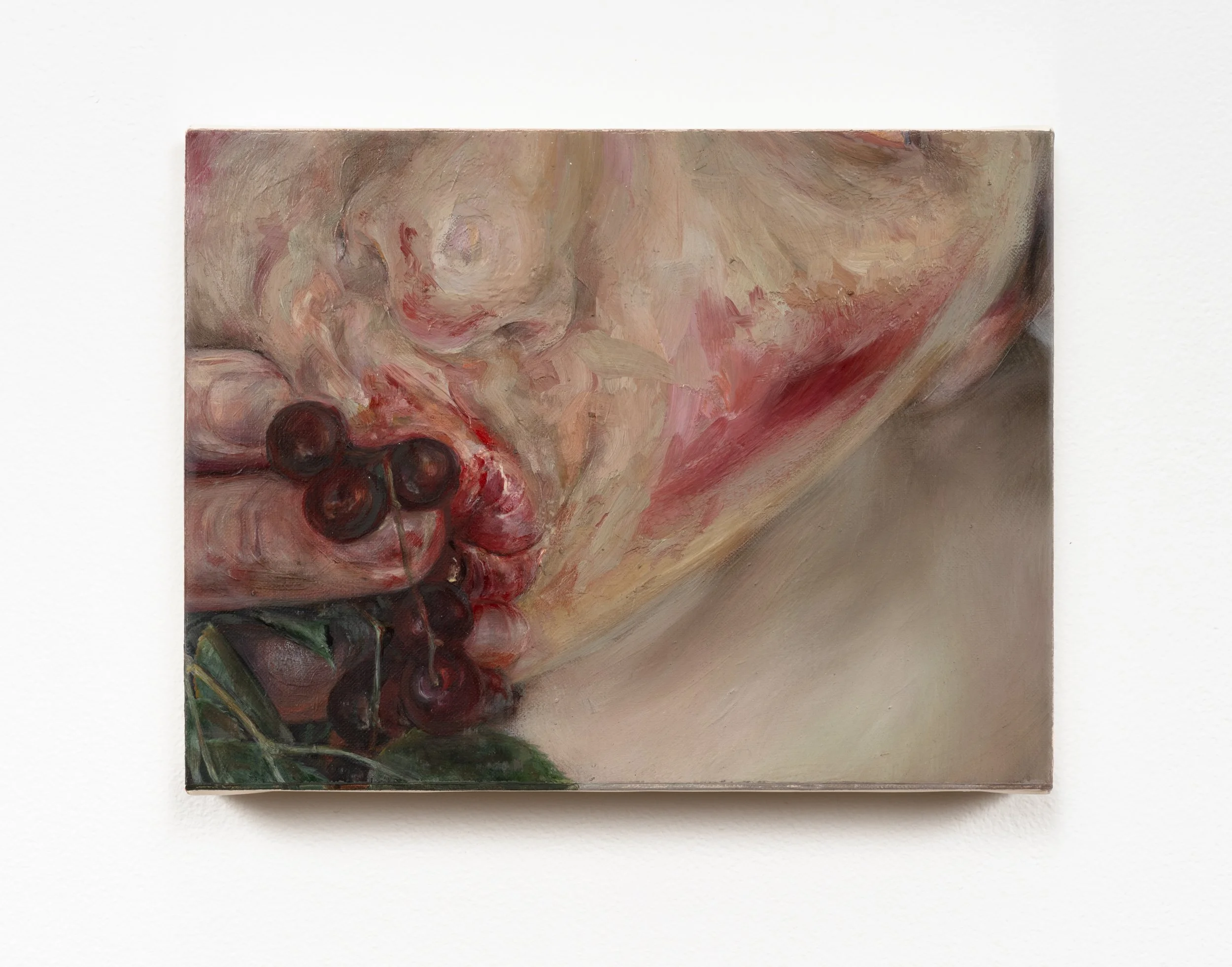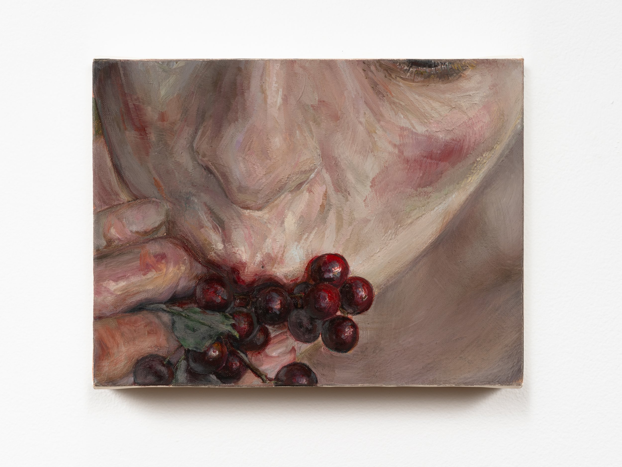 Mazza’s Ceruse paintings are a series of works similar in size and imagery that show fragments of a face in extreme close-up views. Seen together, these works form a connected sequence which is highly performative. Seemingly unwelcome gestures compress and twist her flesh in closely cropped and pantomimed images of emotional theater that are intimate, yet slightly unnerving. Fingers mold and manipulate the flesh of cheeks and lips, as in Equivalence (2008), where a hand forcefully presses red berries to distort the plump, exaggerated, rouged lips. Not intended as self-portraits, these images defamiliarize the facial features, rather than prompt recognition.